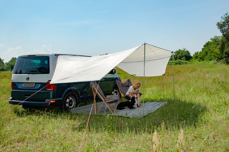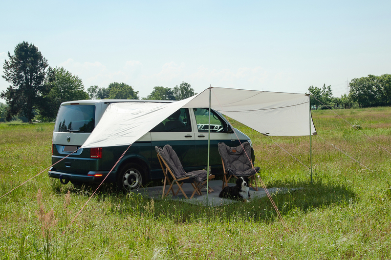 This awning offers lots of variabilities and affords much shadow even to big vehicles. The pivotable sides can be clamped down for additional protection, incl. piping rail.