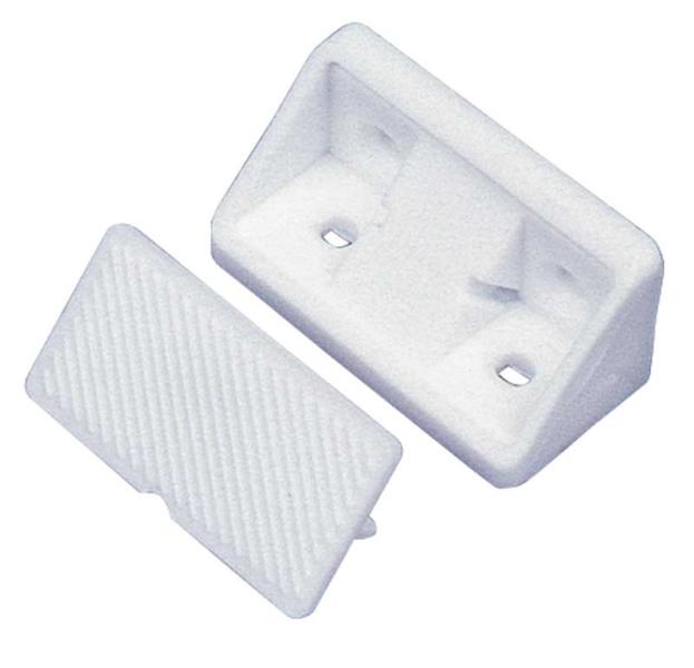 Furniture connector with cap, white. Often used as a corner connector in cabinets. Loose, unpacked goods.