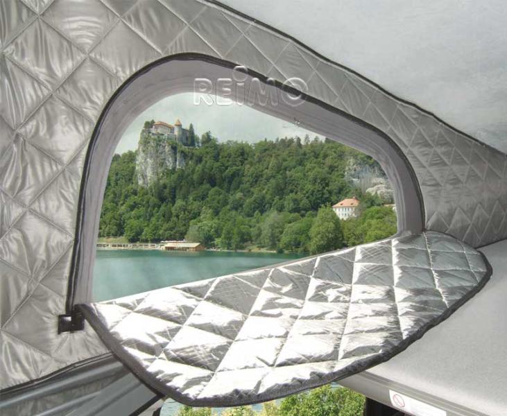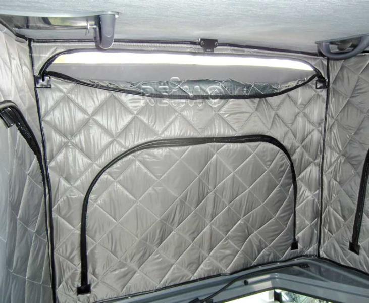 The tent bellows insulation protects against strong sunlight and cold. The effect: the vehicle stays cool longer in the morning. In winter the heating of the roof is much better. External noise is also slightly attenuated. The function of the windows is fully maintained through the window openings. Ventilation openings prevent air congestion. The assembly takes place comfortably in the interior by means of velcro tapes and velcro discs.