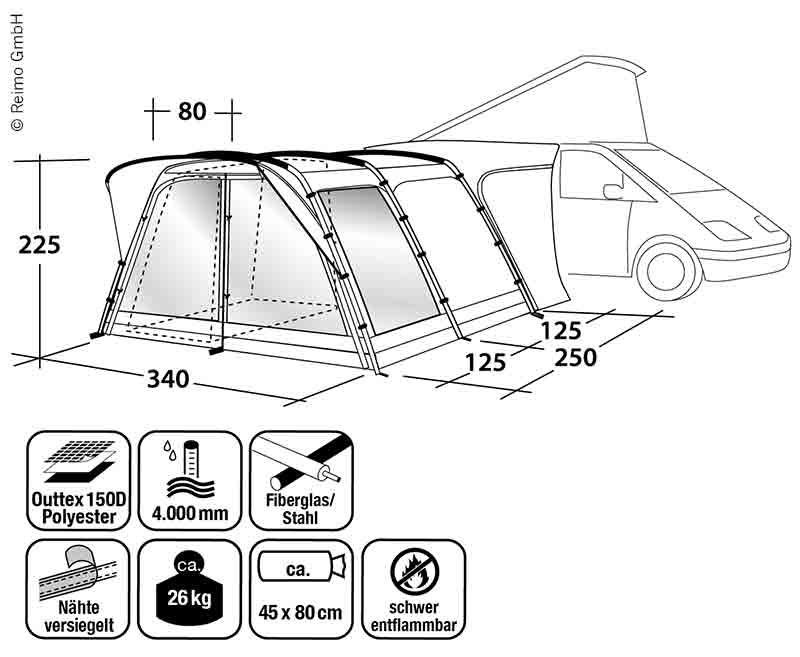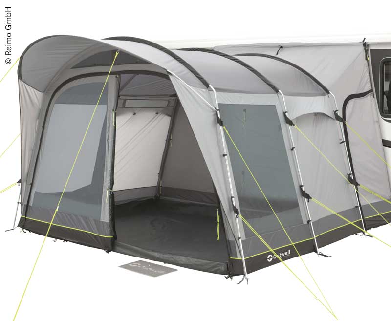 The spacious freestanding awning with poles is perfect for family adventures andround trips. The awning is not only equipped with a lightweight yet sturdy pole and the durable fabric Outtex 4000, but also provides ample space for tables andchairs. With the optional inside tents you can insert sleeping cabins for up to four people.Floor: Double coated 100% polyethylene