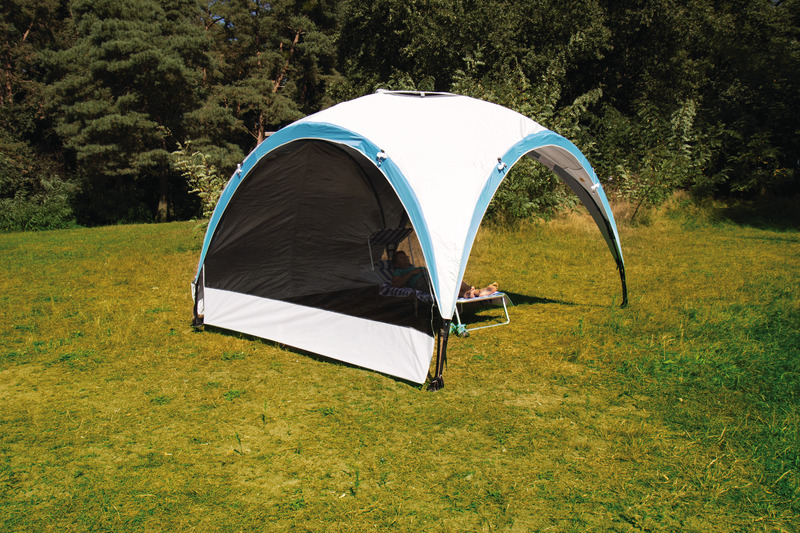 SAMOS - the square, practical pavilion in light grey with a blue border, offers a pleasant standing height of 218cm on the base of 3x3 meters. Optionally, side walls, with or without windows, or mosquito nets can be ordered additionally. The side walls are attached by means of a practical, simple hook-in. Included inthe scope of delivery are tent skin with integrated tarpaulin.for storing the side walls when not in use. Pavilion, steel rodslinen, pegs and pannier. The SAMOS pavilion is made of 150D Oxford Polyester, with UV 50+, with a water column of 1000mm.