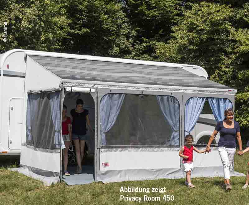 Fiamma Privacy Room is a robust awning for the F80 S, F65 S & F65 L. With FAST CLIP system for windproof connection between awning fabric and side panels. Zippers between front and side wall. Door can be used left or right. Suitable for caravans and motorhomes with straight side wall. Basic set 300cm x 245-280cm
