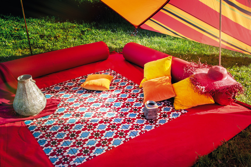 The carpet has a zipper on all 4 sides and 4 reinforced loops with eyelets. Material: Upper: Polyester/Nylex, Underside: PVC/waterproof. Dimensions: 250 x250 cm, pack size: 55 x 18 x 9 cm, weight: 2.9 kg