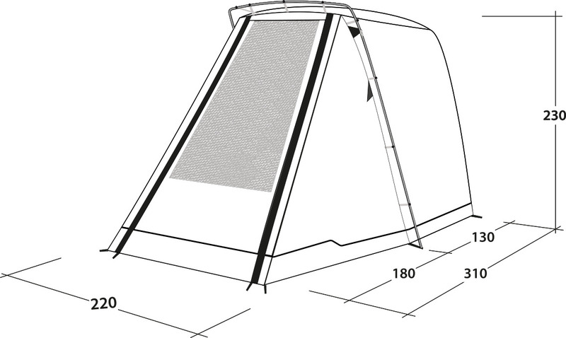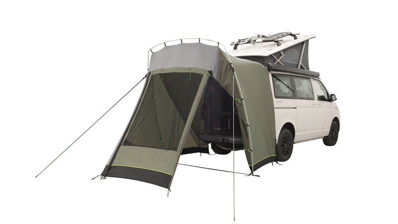 Compact rear tent for camping buses. Perfect for camping and short trips for cooking, day shelter or changing room. You will appreciate the value of the extra space that the ingenious Sandcrest L offers for a more comfortable van life. The smart design allows you to close and lock the tailgate securely, or leave it open at night while you keep the van well ventilated with the internal insect screen. With only one aluminum arch, it is very quick to set up and it has a very small pack size. The clever attachment system means that sliding doors are not blocked by guy ropes. There is an insect screen window in the large tent entrance that can be closed with a waterproof curtain. As a bonus, you can set up the door as a sun canopy. (Set-up poles not included)