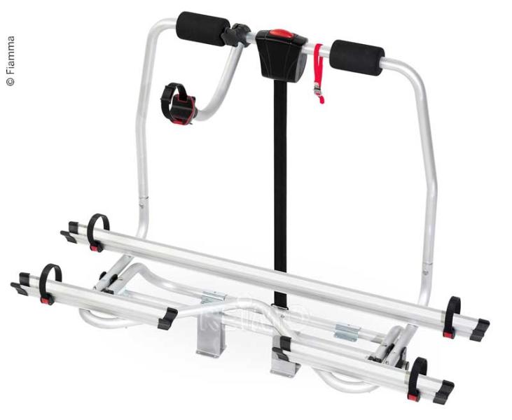 Bicycle carrier for the caravan drawbar with a maximum load capacity of 60 kg. Suitable for 2 bicycles. With infinitely variable lowering mechanism. The support bracket engages automatically. Extension to 3 bicycles possible. (Set for 3rd wheel consists of: 44114 Rail Quick rail + 44132 Bike Block II).