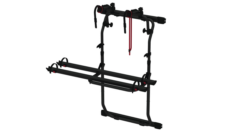 Support bracket: positioning in 2 heights possible. Lowered support bracket for easy loading. Open vehicle doors without removing the bikes.