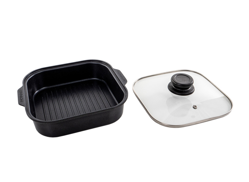 Grill pan with high rim as an optimal extension of the gas cartridge stove Cook'n'Fold (Item No. 706622). Designed to achieve high performance even with a small flame. To prepare gently and evenly even more in reduced space.