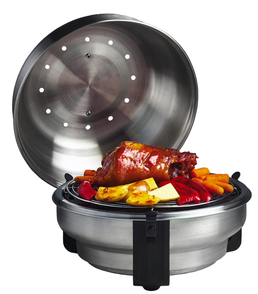 The perfect grill for camping vacations, at the terracce and on the balcony. The aluminium lid reflects the heat inside the grill and so it provides a perfect heat distribution during the preparation of your food. Material: grill stainless steel. Handles and legs: glass fibre reinforced nylon. Size: height 28,5 cm ø34,5cm.