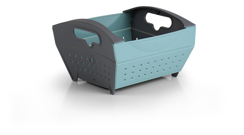 the foldable sieve convinces by its high quality. It has a locking button, so that it keeps its small packing size when closed. Folded 2.5cm high, opened 15cmhigh. It can be used not only as a sieve for washing fruit, vegetables and salad, but also as a storage basket. The colour combination aqua-marine/grey in trendy pastel matches the foldable dish dryer from this series. Dimensions: open24x23x15cm,folded:32x30x2,5cm