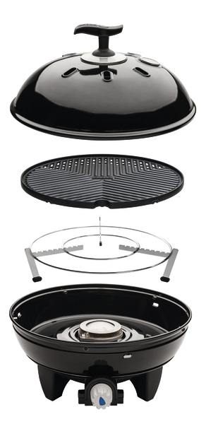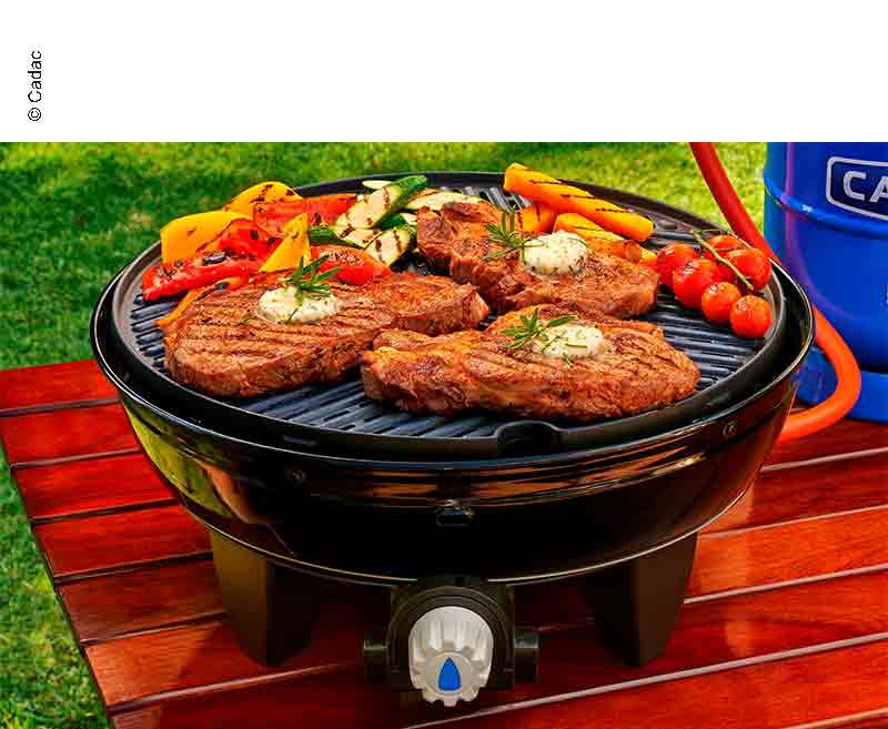 With new GreenGrill ceramic-coated grill grid Ã? 38 cm. The deflector on the back of the grill grate distributes the heat ideally. Includes 1x pot stand and practical carrying bag. Operated with a threaded cartridge with EN417 pressure reducer, Cadac Power Pak or refillable gas cylinder (not included).