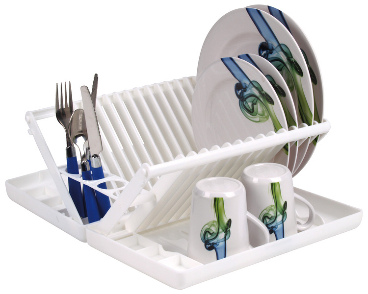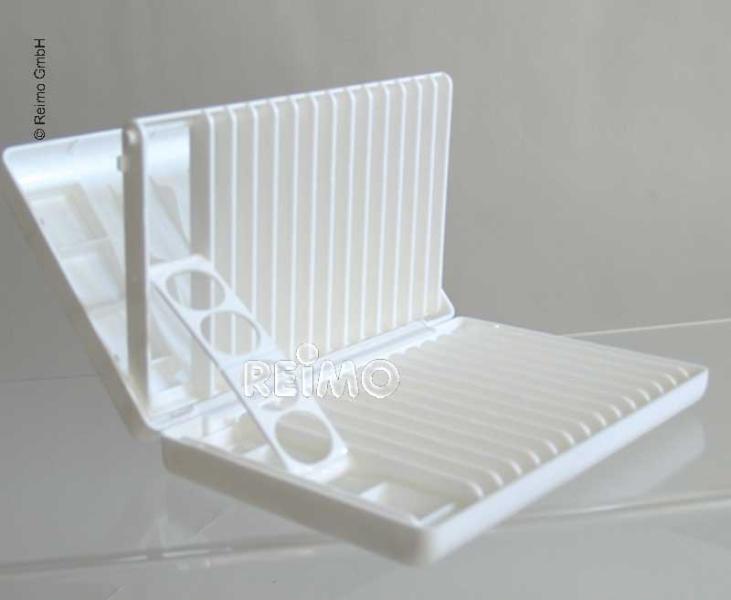 Tableware dryer white, fold-away. Plastic. Admeasurements opened approx. w 30,5 x h 15,5 x d 42,5 cm. Admeasurements closed approx. w 30,5 x h 5,5 x d 21 cm.