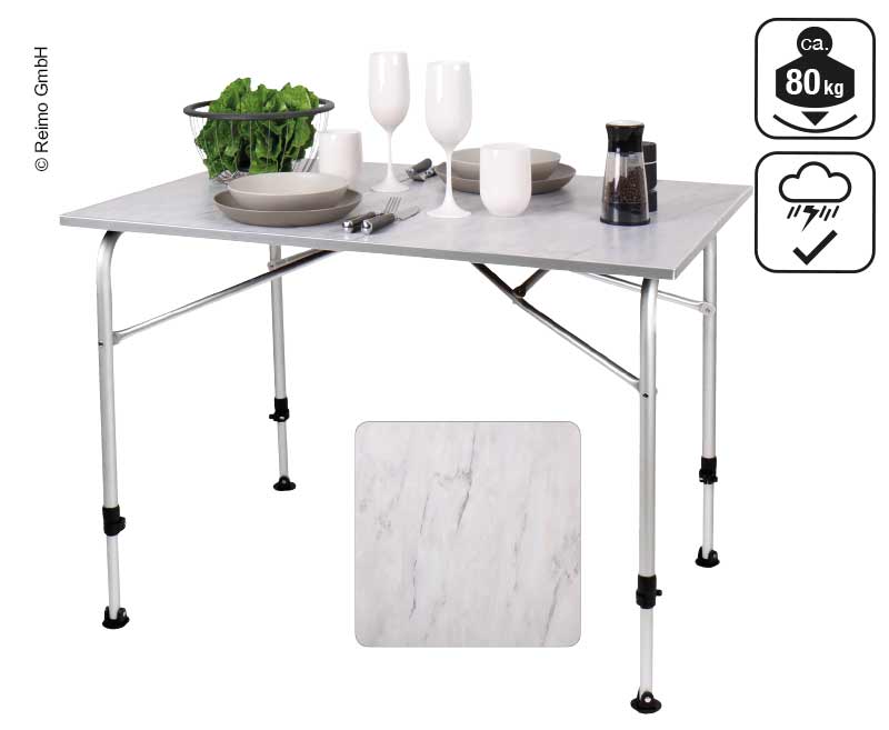 This camping table has a weatherproof table top with a noble marble decor and plate feet that prevent it from sinking in. It can be quickly adjusted in height from 59 to 72 cm in one easy step. Table top: 100 x 68 cm made of PP honeycomb, glass fibres and resin. For 2-4 people. Weight: 4.3 kg. Pack size: 100 x 68 x 6 cm.