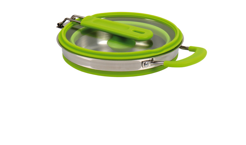 Approx. 2 litre volume with minimum packing size. Can be used as a pot or pan. The practical handle with silicone coat can be folded into the pot. Folded only 5cm high. The stainless steel ring ensures high stability and good stability. Glass lid with non-slip silicone handle. Material: stainless steel and silicone. Colour: lime