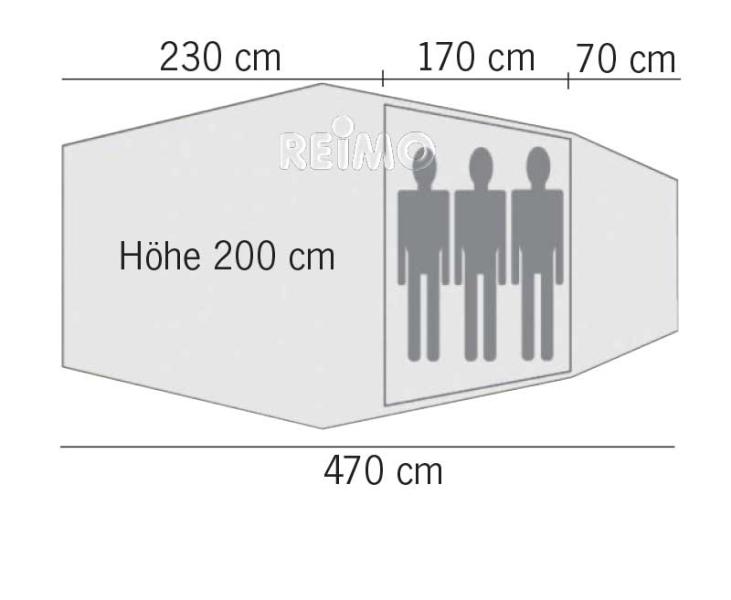 A 3 person tent with a large entrance and a height of up to 2 meters.