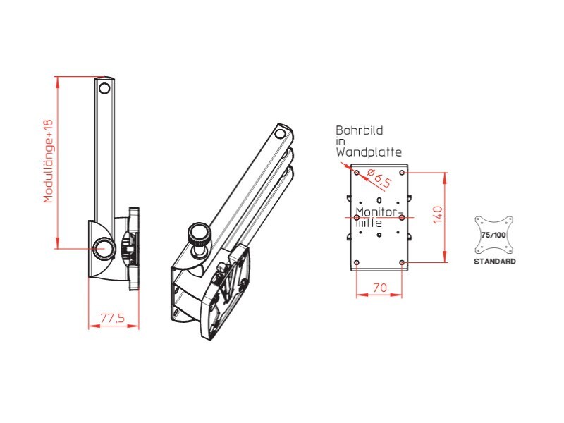 This TV mount has a large swivel range and locking bolts. It is very light, high quality workmanship, offers a noble design and a large carrying capacity of up to 10 kg. A quick release plate allows for quick removal of the TFT. The holder still works even when the TFT is hanging very high. The double-jointed arm has an installation height of 65 mm and an arm length of 350 mm. The extension features 780 mm.