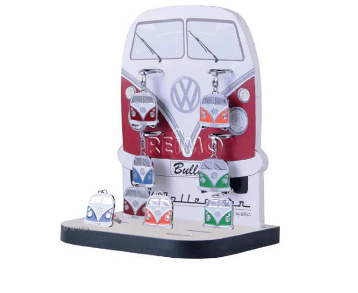 Display with 12 key rings in 4 colours in Bulli T1 front design. Material pendant: chrome plated with enamel.