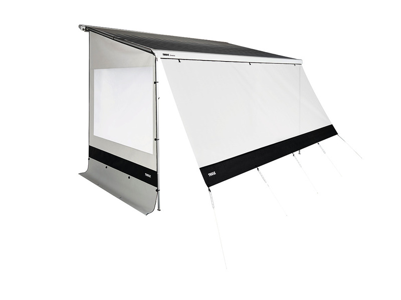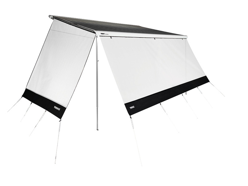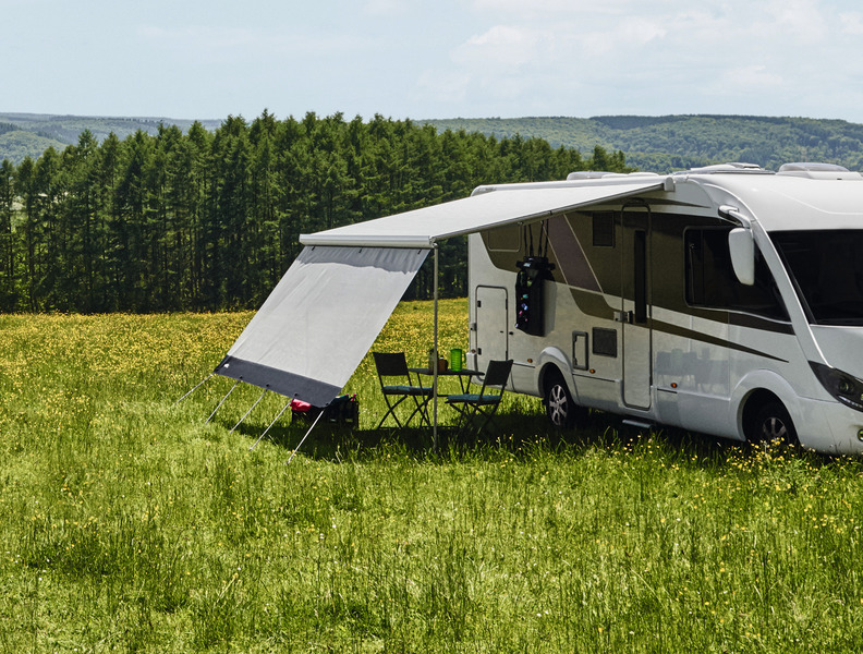 Rain + Sun blocker for the awning front, G2 modular system, several Rain + Sun blockers can be combined side by side in the awning front. Made of translucent mesh fabric. Protection against sun rays.