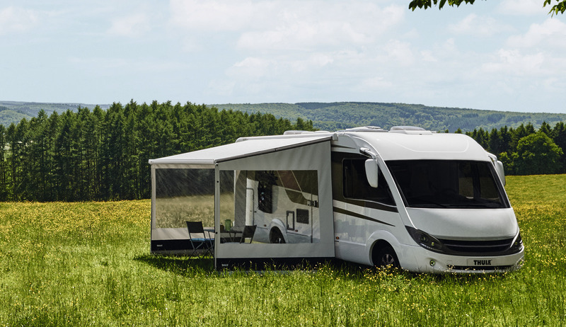 Rain + Sun blocker for the awning front, G2 modular system, several Rain + Sun blockers can be combined side by side in the awning front. Made of translucent mesh fabric. Protection against sun rays.