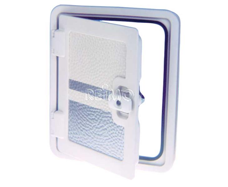 LURAN S material very robust. Colour Fiat white from model 95. Cut-out metal will be used as filler. With a solid lock and 2 security keys. Revolving rubber seal and 2 LURAN S hinges. For wall thicknesses from 23 - 35 mm. *Calculate an additional 1,5 cm assembly dim for the frame.