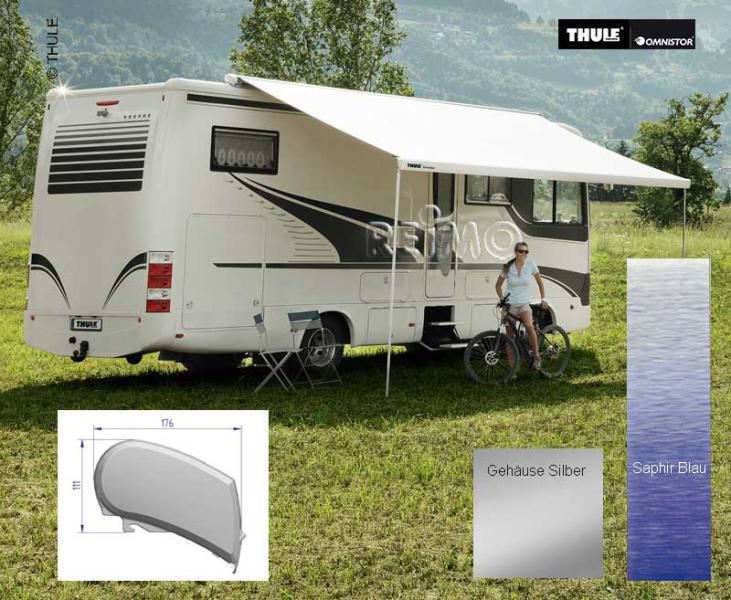Quality awning for extra large vehicles. The enormous extension of 3.00 metres provides more shade. With a width of 6 metres, the roof awning is also suitable for the largest motorhomes or caravans. High fabric tension due to additional diagonal tension arms. Color of the cloth is sapphire blue. The housing is silver.