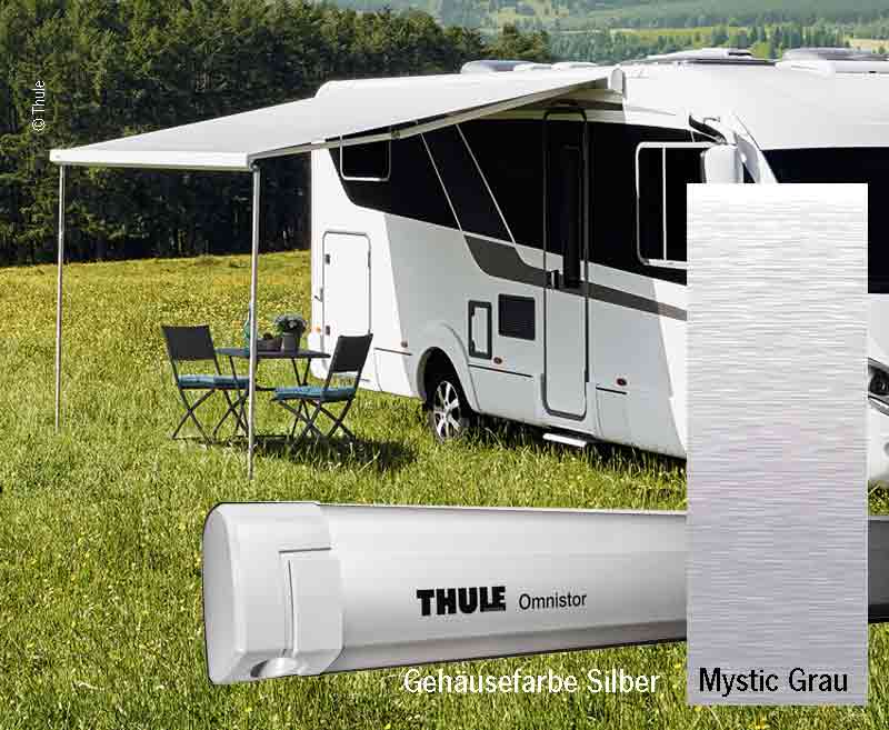 Thule Omnistor 5200 - The wall awning is up to 3% lighter than its predecessor. The sturdy aluminium housing with integrated rain gutter is available in white, black and silver. The robust articulated arms with the Thule Pitch System failure adjustment allow a freely adjustable failure angle.