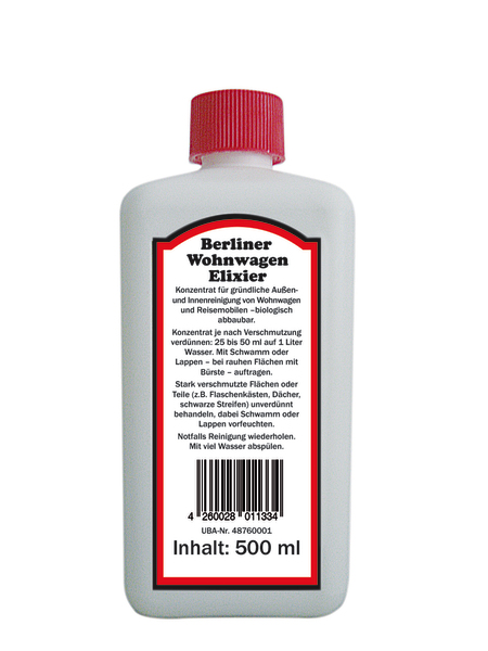 500 ml concentrate for thorough exterior and interior cleaning of mobile homes or caravans. Add 25 to 50 ml to 1 litre of water (depending on contamination). In case of heavy soiling, also apply undiluted. Rinse off with plenty of water.