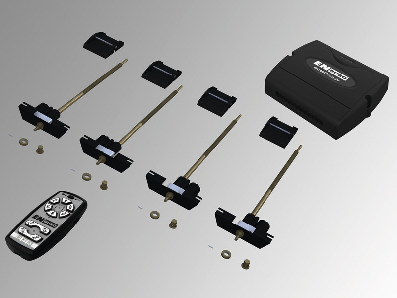 ENDURO® autoSteady - makes the original supporting feet of the caravan fully automatical and stabilizes your caravan in only 90 seconds. The autoSteady system replaces the original spindles at the caravan's supporting feet. LED-indicator while overloading and LED-indicator with sound at the remote control. Replaces the original spindles at the caravan's supporting feet. Simple installation into the caravan's supporting feet. Applicable for AL-KO supporting feet "stable and premium". The ground clearance remains unchanged. 2 operation functions: AUTO - serves all supporting feet automatically SINGLEFUNCTION - serves the supporting feet each individually. Technical data ENDURO® autoSteady: power supply: 12 Volt, total weight: approx. 13,5 kg. Authorised caravan weight: approx. 9 kg, gross vehicle weight caravan: max. 2000 kg, middle/max. current consumption: 2 A / 20 A, power supply: 12 Volt / min. 50 Ah, remote control: incl. 1 PP3 9 V battery.
