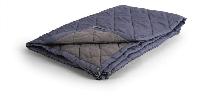 With 35cm long opening in the middle to pull the blanket as a poncho over the head. Upper: 210T Poylester Ripstop, lining: 100% cotton with flannel brushed, filling: 180g/m2 silk-like cotton. In a practical packing bag.