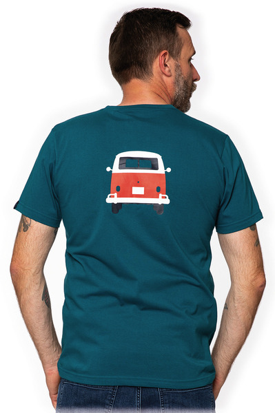 Colourful t-shirt with bulli print for men. Colour: petrol blue. GOTS certified. Material 100% organic cotton.