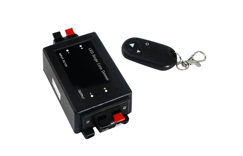12 V dimmer with remote control for lights up to 96 W. Functions of the remote control: brighter/darker/on/off.