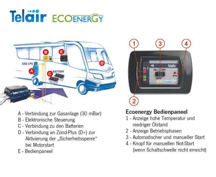 The ECOENERGY generators make independent from the stationary power supply and guarantee autonomy and comfort. The immediate power supply allows by an inverter the use of electrical devices like hair dryer, toaster or microwave. The operation in summer is safe up to +50°C, without any worries about the battery consumption. In the winter months the ECOENERGY acts down to -25°C as a permanent energy source too. It is eco-friendly: LPG supply (or propane) makes it compatible with the latest environment guide lines. It is quiet: the noise level is especially low (only 51dBA). The system generates 12V according to the model between 20 and 25 Amp/hour. An additional tank is not necessary because the gas bottle of the motor home will be used. It is compact and light. So it is an optimal and safe solution for the installation below the vehicle, even at motor homes with abated chassis. It is especially conceived for the innumerably ignition- and circuit-cycles. Technical features: automatical operation: start 11,9V stop 14,5V, operation temperature with propane gas: +50°C ± -25°C, nominal current a/h : 25 A/h, power consumption with LPG gas: 30 mBar ± 2, gas consumption per hour: 0,29 Kg/h, lubricating oil consumption: 1l/115h, noise level at 7m distance LpA: 52dBa, weight: 19kg, dimensions without bail (hxwxd): 565x380x250mm, recommended battery: 160 ± 300 Ah, operation load dependant: yes, mountains up to 2300m: yes, connection cable for controlling: 5m.