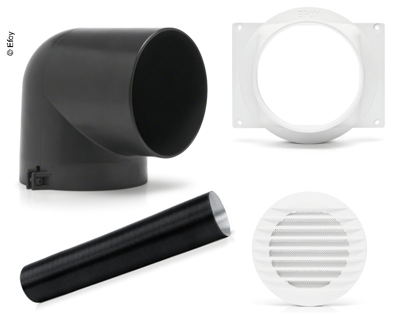 This set includes the flange for mounting on the Efoy Comfort fuel cell, a flexible waste heat pipe, a 90° angle and an outer cover. Diameter: 10cm.