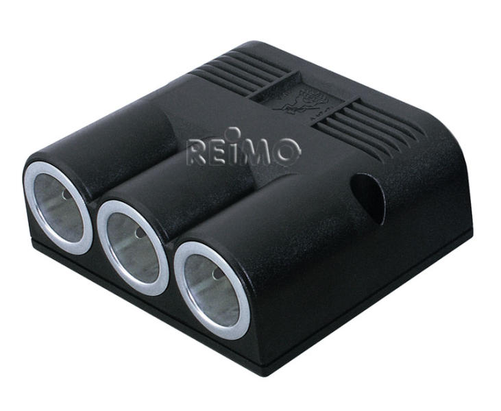 Build-up 3-outlet socket 12-24V, max. 20A with cable cross section 2,5mm², (16A with 1,5mm²). Inside-Ø of the sockets 21 mm.