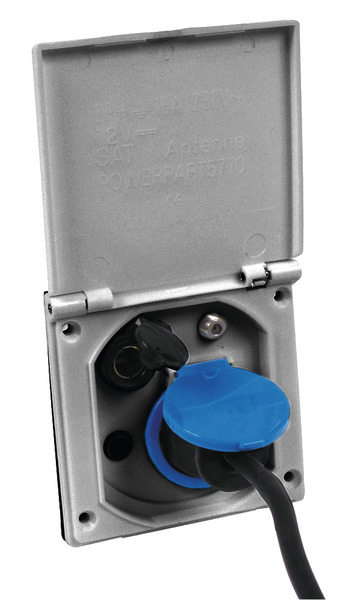 Multifunctional-external socket for 12V/230V- antenna/TV Sat. Colour silver-grey, dimensions 100 x 100 mm.
