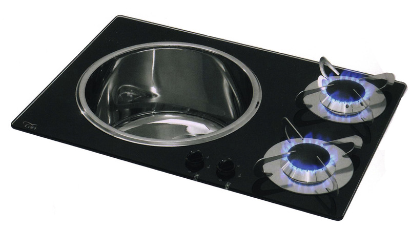 Sink-hotplate combination with stainless steel sink and 2 flame hotplate . Heat- and scratch resistant crystal glass. 2 gas burner 2000 Watt each. Consumption 127g/h. Measures: l60xw42xh3 + 18 cm (measures sink Ø30 cm x h18 cm). Weight 15 kg