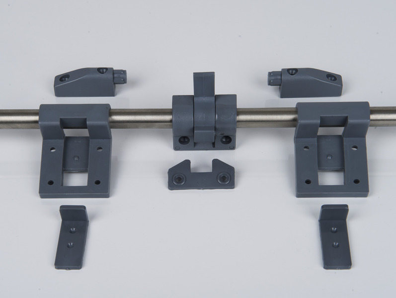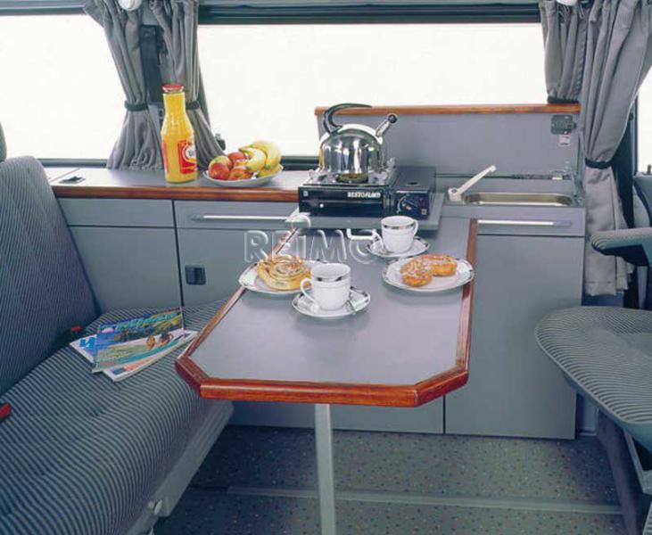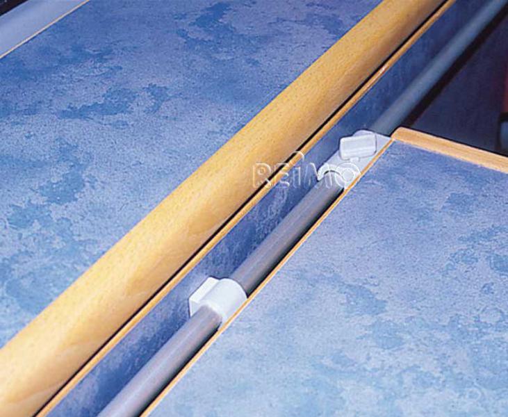 Table slide rails with stainless steel mounting tube for unhooking or sliding the table. Lockable sliding safety device, table rail can be shortened as required. Easy access to benches and to storage boxes by sliding or unhooking the table top, fast bed construction.