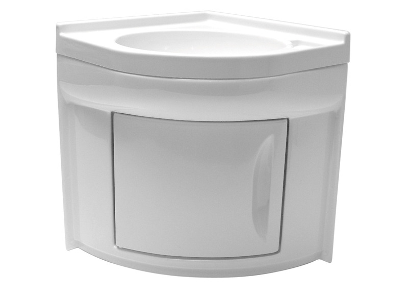 Corner sink including base cabinet with door for bathroom utensils.