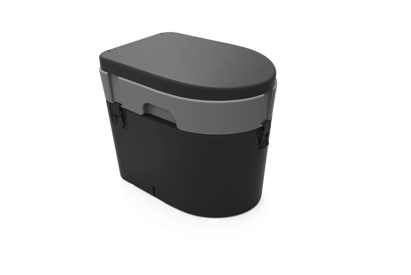 SPARE PARTS The environmentally friendly composting toilet consists of two separate parts: Top- Unit and Bottom- Unit, which can be connected with 3 robust latches. Which allows safe separation of solids and liquids. The solids container with lid and 7.5 liters and the liquid container with cap and 8 liters volume offer a large capacity. The simple and clean design of the toilet facilitates cleaning and the robust design allows a load capacity of up to 200 kg.