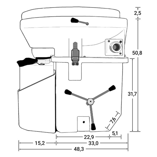 The toilet has a space-saving spinning wheel and a 12 V connection for the built-in fan. If it is to be operated on the 220 V mains, an additional 12 V power supply unit is to be ordered.