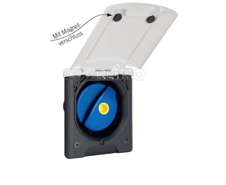 The lid with magnet closure can be opened up to 180°. KTW approval. Plastic IP 44. Installation opening approx. 95 mm. Construction approx. 16 mm. Outer dimension h145 x w 130 mm. With companion flange 40 mm. Deariation/overflow with 10mm connection. Without tank flap. For completion please order flap, set of keys and lock separately.