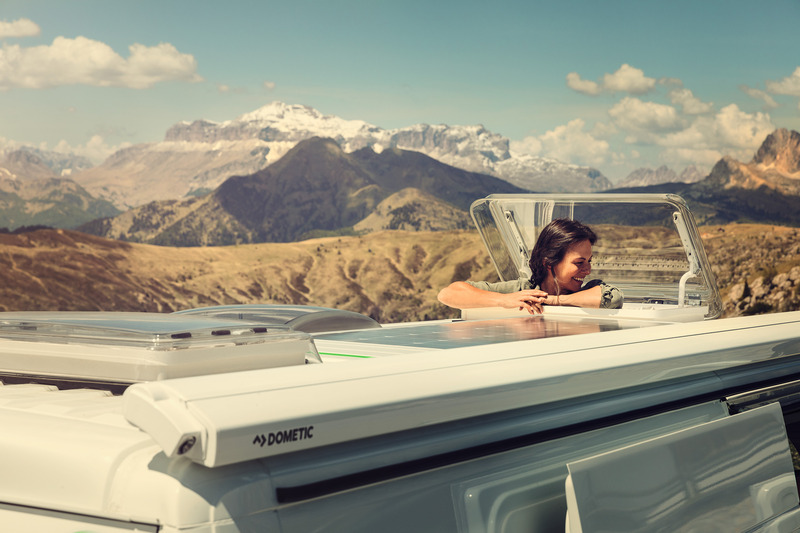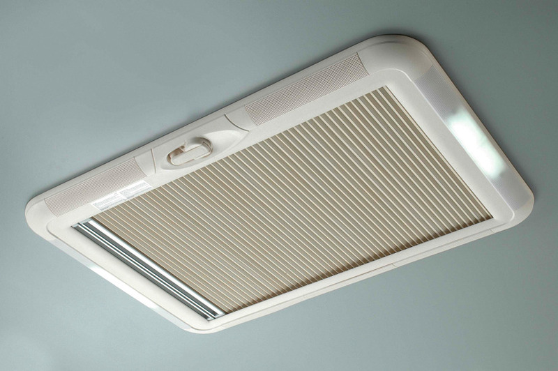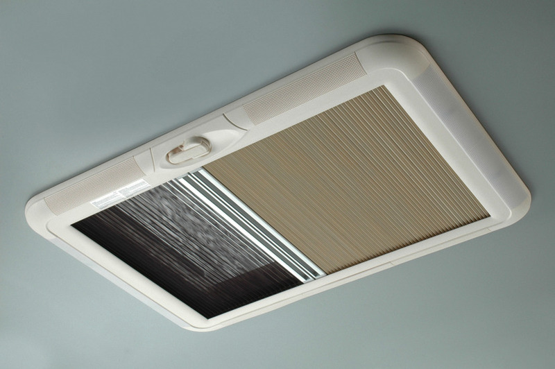 Outstanding insulation with duo honeycomb system. Integrated lighting (2 x 8 Watt) for harmonious light. Light exclusion and mosquito protection roller blind with side guidance rails. Crank handle opening roof cover with transparent dome. Can be locked open at angles up to approx. 70 degrees. Weather resistant plastic (ASA). Safe, easy to operate, with sturdy side support rails on both sides. Can be built into roofs of thicknesses between 27 and 60 mm. Can be fitted acroos or parallel to direction of travel. Height above roof 105 mm