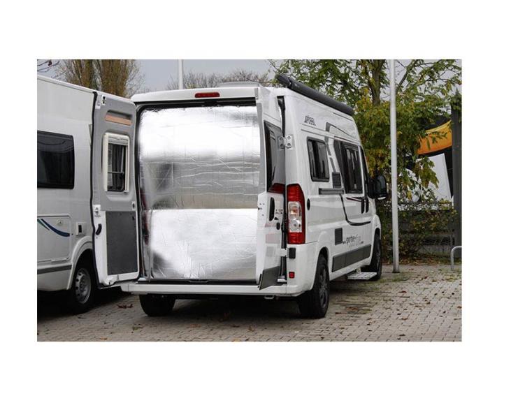 Thermal curtain for the rear door creates a draught-free atmosphere and provides good insulation in the sleeping area. It consists of a sandwich construction with an aluminium insulating layer on the outside. Inside it is covered with a friendly velour fabric. The curtain is in two parts and is fixed to the inside of the wing doors with magnets. The fabric overlaps in the middle.